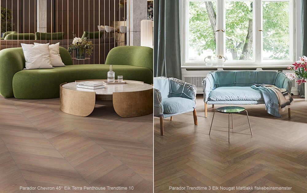Både chevron og fiskebensgulv er mer enn bare gulv – de fungerer som aktive designelementer i rommet.