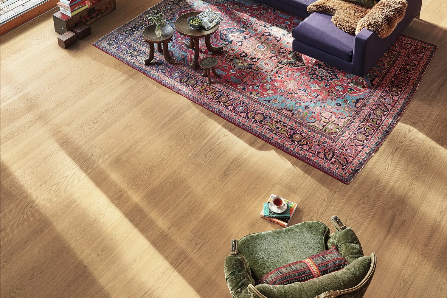 Gulvet på bildet heter Meister Lindura Pure Natural Eik, som er et herdet tregulv.