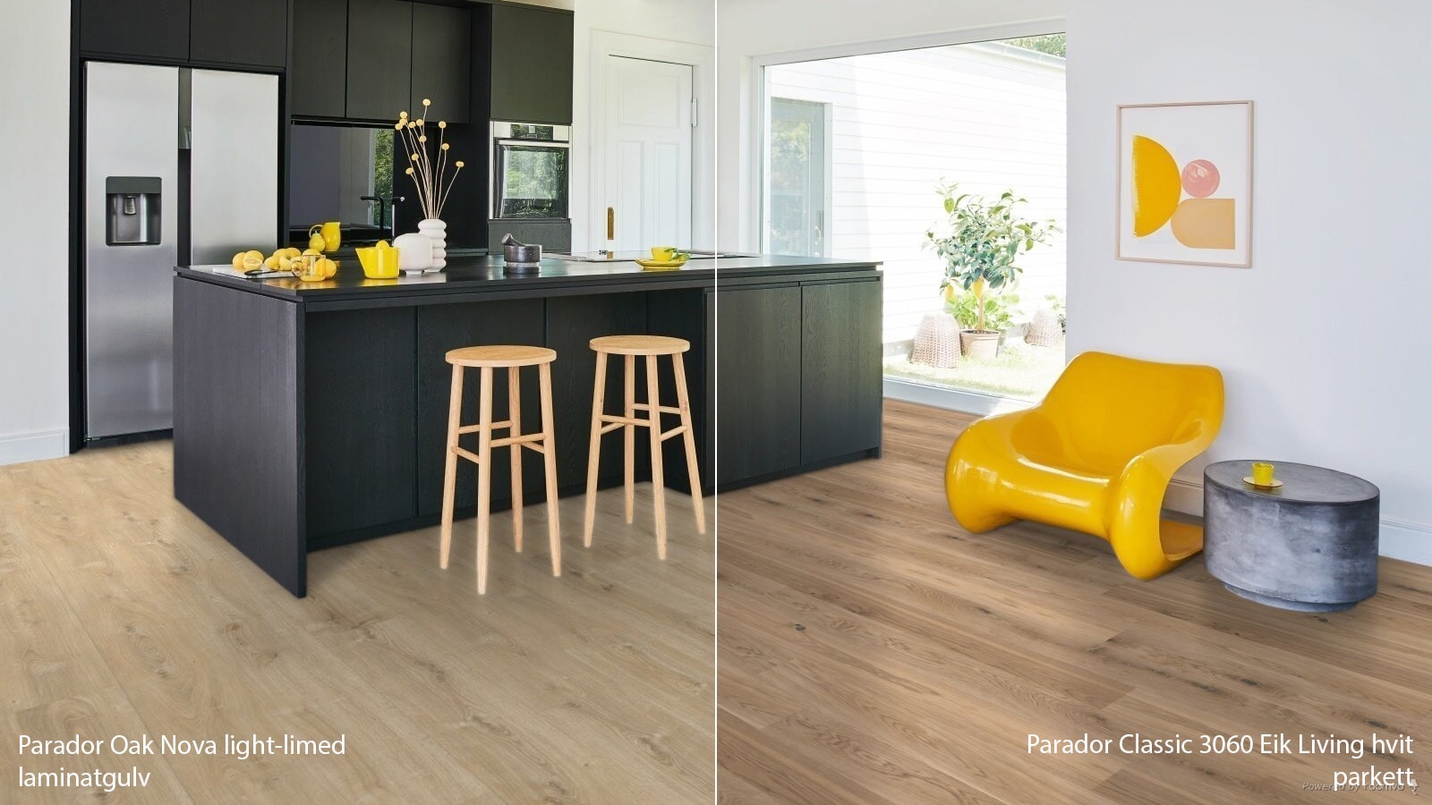 Laminatgulv er laget av komposittmaterialer og har et trelignende utseende. Det er billigere enn parkett og krever mindre vedlikehold. Laminatgulv er mer holdbart enn parkettgulv, men det varer ikke så lenge da det oftere blir byttet ut fordi det gir en hardere og kaldere følelse å gå på. Laminatgulv kan ikke slipes eller lakkes. Parkettgulv er laget av ekte tre og kan vare i mange år hvis det vedlikeholdes riktig, men det er også mer kostbart enn laminatgulv.