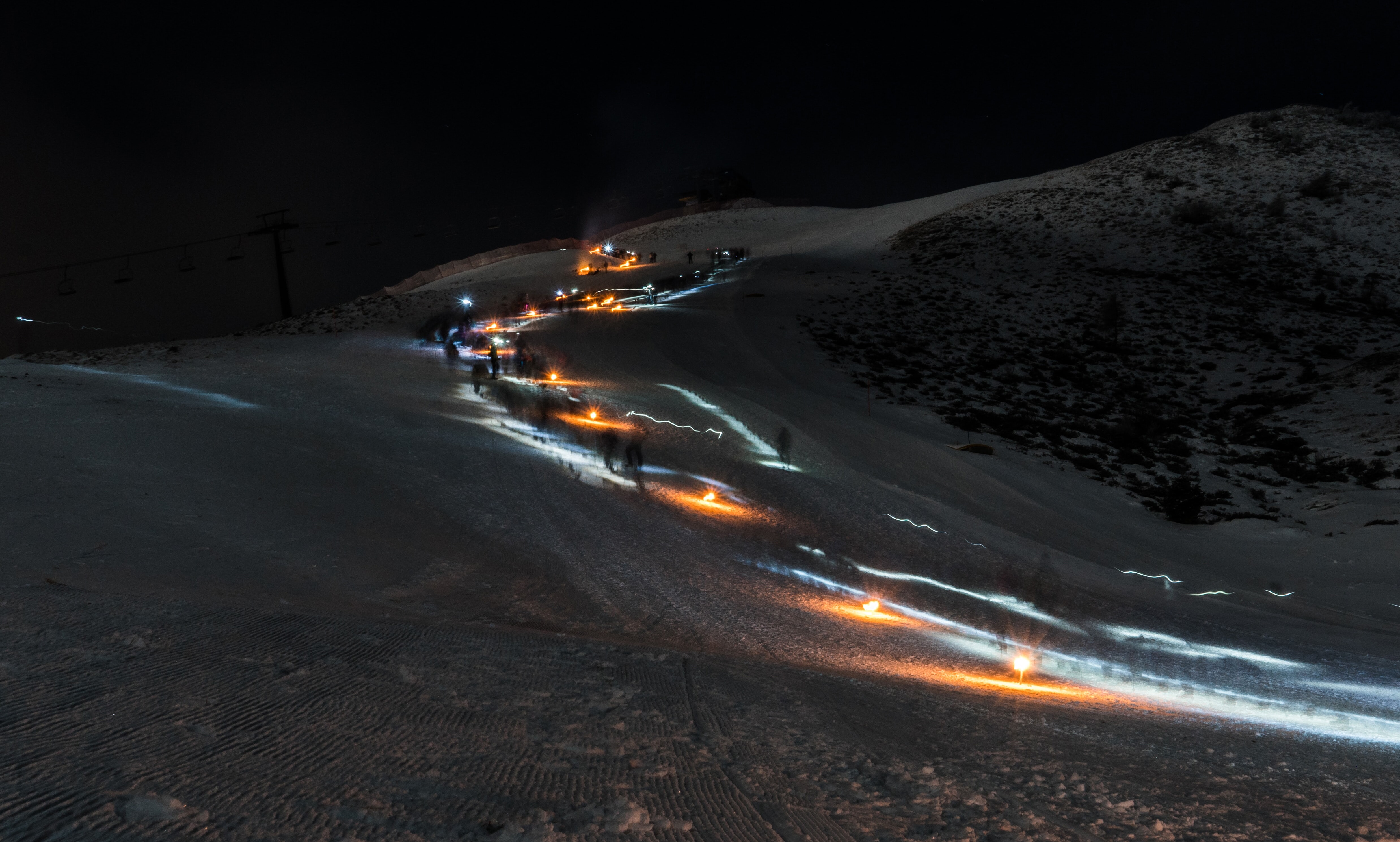 Snøen reflekterer naturlig lyset, og faklene bryter den monotone hvite paletten. De vertikale flammene skaper en visuell kontrast som fanger oppmerksomheten og gir en vakker og dramatisk effekt. Resultatet er en visuell fest for øynene, spesielt når snøfnuggene faller som små diamanter fra himmelen.