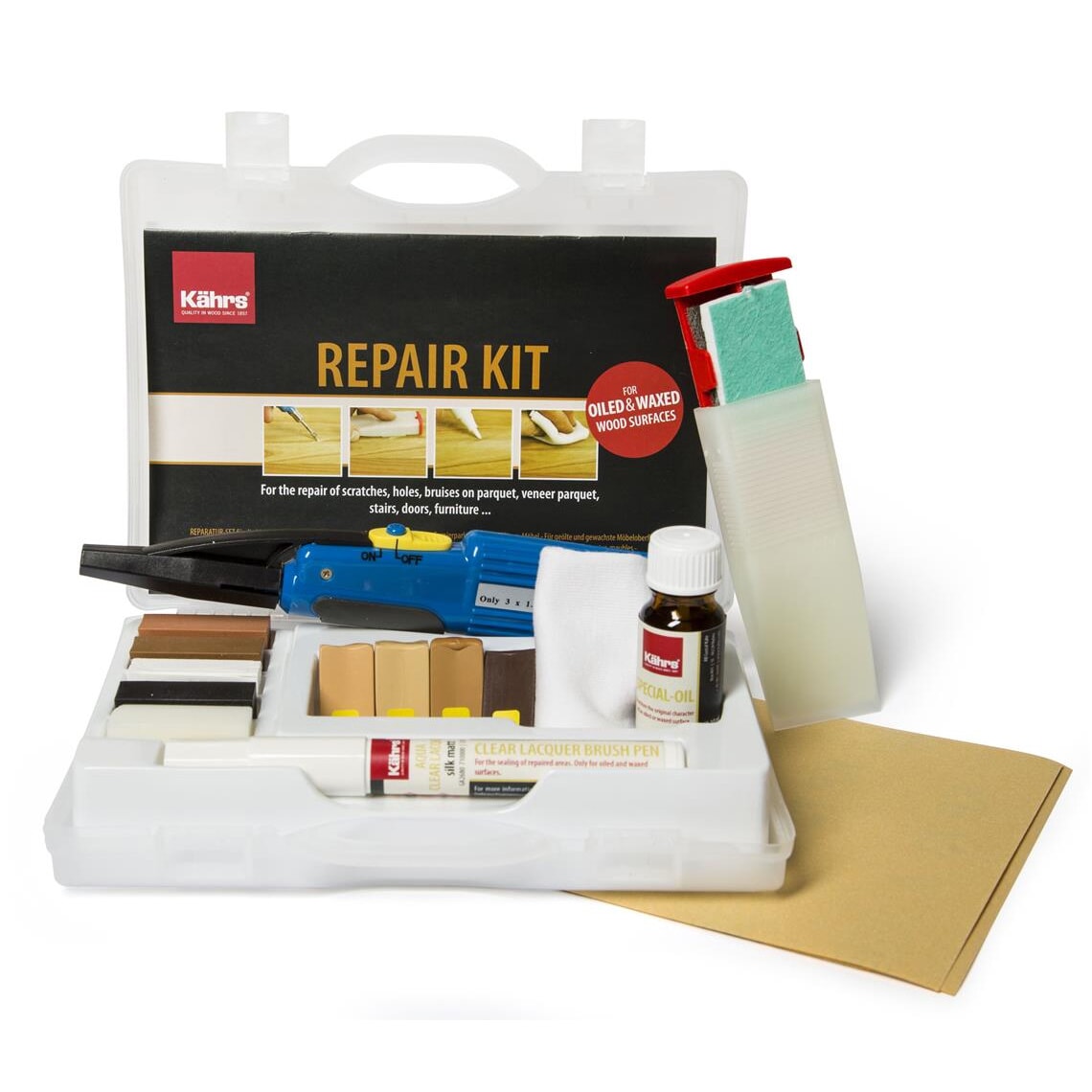 Reparasjonssett for oljede gulv. Består av 9 voksstaver i ulike farger, 1 smeltepenn, sandpapir, olje m.m.