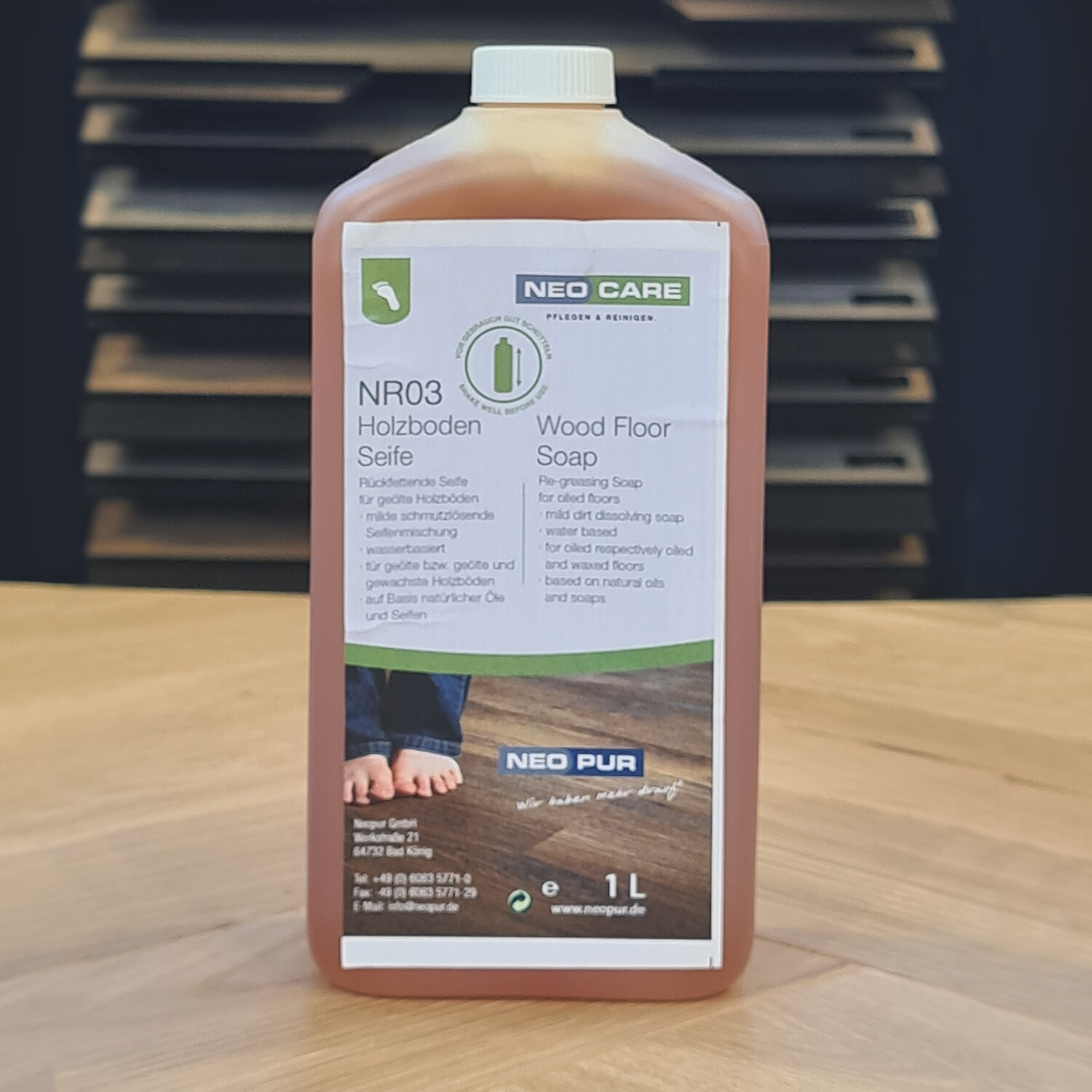Neocare tregulvsåpe NR03 er en vannbasert, høyt konsentrert såpekombinasjon basert på naturlige vegetabilske oljer og såper uten tilsetning av dufter og konserveringsmidler. Neocare brukes til pleie og rengjøring av oljede og voksede tregulv. Neocare har en fuktighetsgivende effekt som beskytter det oljede tregulvet. Mild, smussoppløselig såpeblanding. Vannbasert. For oljede eller oljede og voksede tregulv. Basert på naturlige oljer og såper.