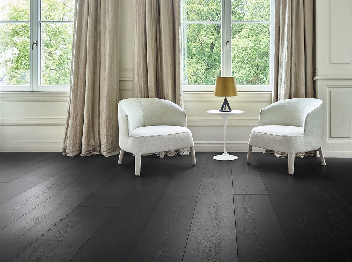 Dette svarte gulvet gir rommet særpreg, karakter og tyngde. Svart er en nøytral farge som lett kan kombineres med andre farger, noe som gjør rommet lett å møblere. Coretec XL-end Chantilly er en tykk klikkvinylgulv med høy slitestyrke og 3 mm korkunderlagt. Korkunderlaget er varmt og demper trinnlyd fra å forplante seg.