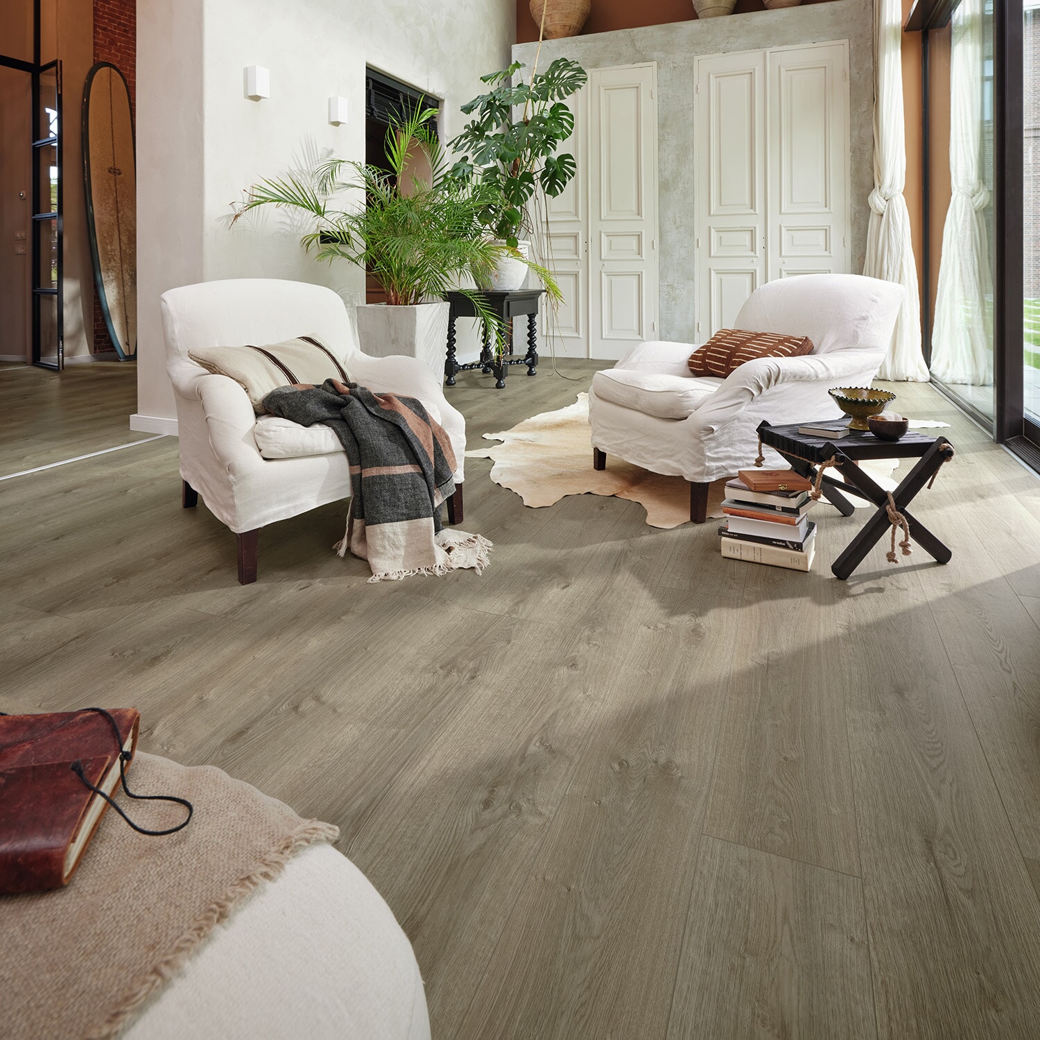 Grå gulvfarge på klikkvinylen gir rommet et elegant og moderne preg. Grå er en nøytral farge som passer godt til en rekke interiørstiler. Dette er perfekt for å skape en koselig atmosfære i stuen, soverommet eller andre oppholdsrom. I tillegg til disse fordelene kan grått klikkvinylgulv også gi assosiasjoner til drivved og til tregulv som har blitt eldet gjennom mange år. Dette kan gi rommet en varm og lun atmosfære. Dette gulvet er et flott valg for å skape en hjemmekoselig bolig.
