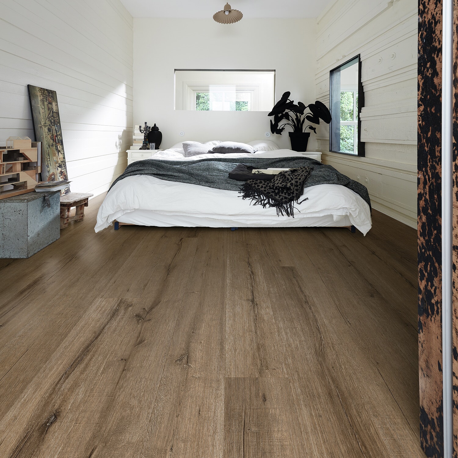 En mørk klikkvinyl med gråskjær som gjør rommet lunt og koselig