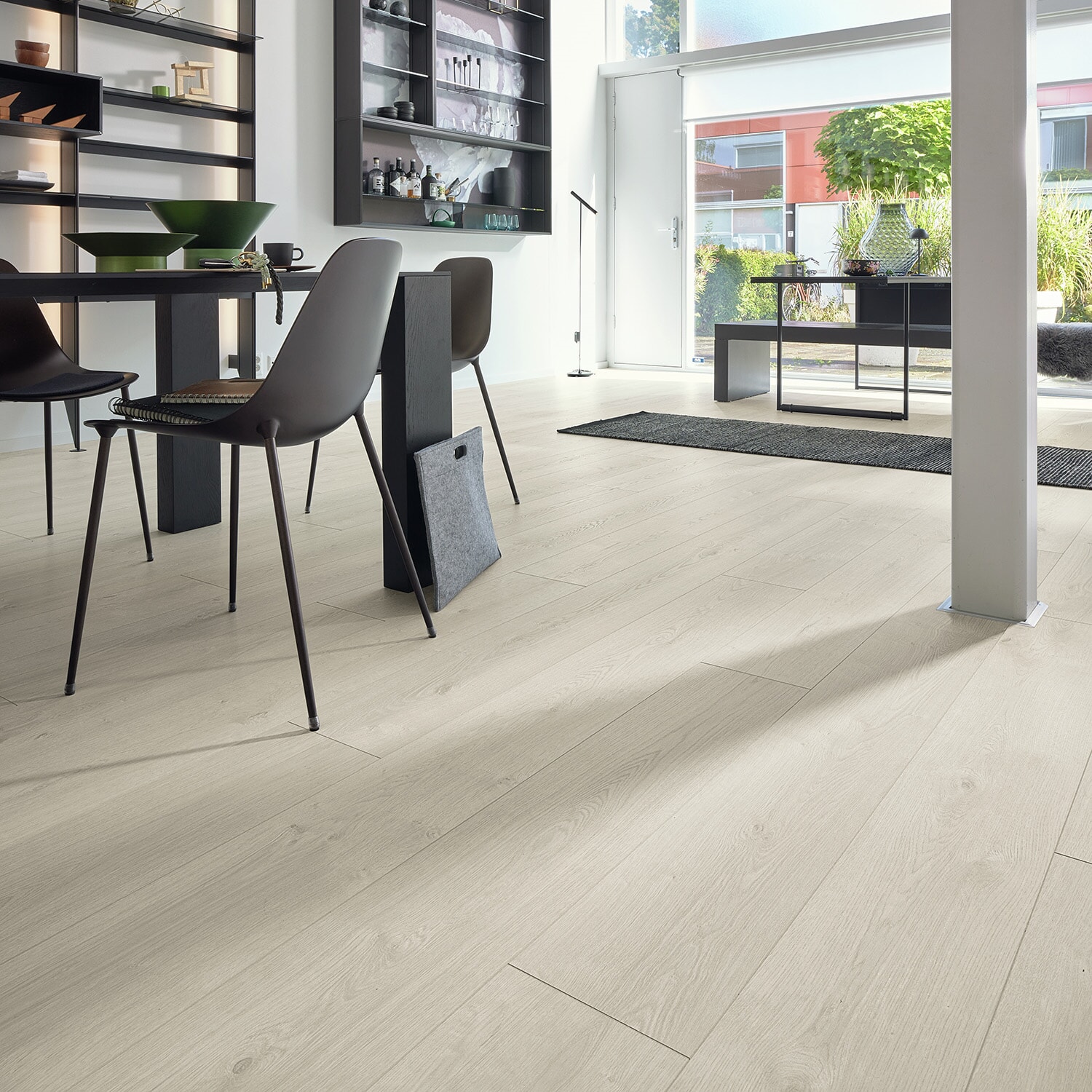 Et hvitt klikkvinylgulv er et moderne og elegant valg. Den hvite fargen reflekterer lys og får rommet til å virke mer åpent og luftig. Dette er perfekt for små rom eller rom med lite naturlig lys. Hvite gulv gir en moderne og minimalistisk look til hjemmet ditt. De kan være med på å skape en rolig og avslappende atmosfære. Klikkvinylgulv er slitesterke, vanntette og enkle å rengjøre. De er et ideelt valg for travle familier og de som har kjæledyr.