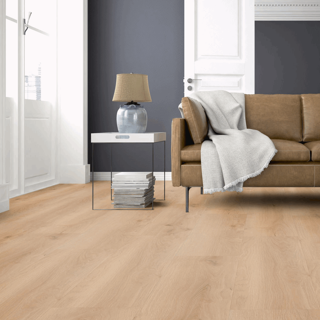 Eik Rotterdam byr på et mellomlyst, naturlig eikeuttrykk med myke sand- og honningtoner og et diskret gråbeige slør. Den matte, børstede overflaten gir ekte trefølelse uten gjenskinn, slik at gulvet oppleves varmt og rolig i både dagslys og kveldslys. Gulvfargen gjør at rommet virker lysere og mer åpent. Det er perfekt til lyse vegger og naturtekstiler, men også som lun kontrast til mørke kjøkken, sorte detaljer og metall. Resultatet er et tidløst, harmonisk grunnlag som får møbler og interiør til å stå enda tydeligere fram.