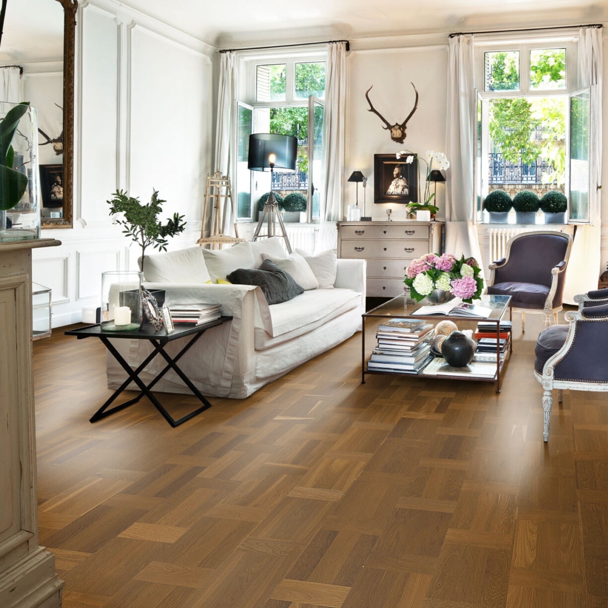 Eik Palazzo Fumo er et gulv i klassisk Hollansk mønster som minner om en epoke med praktfull gulvstil. Inneholder eikens naturlige fargevariasjoner med større fargeforskjeller. Gulvet har en moderne tvist i røkt og matt lakk som gir en varm brun tone. Kan inneholde mindre kvister. Dette er en mørk mønsterparkett som skaper dybde og intensitet i interiøret. Dette mønsteret sammen med den brune fargen, gjør at gulvet oppfattes som elegant.