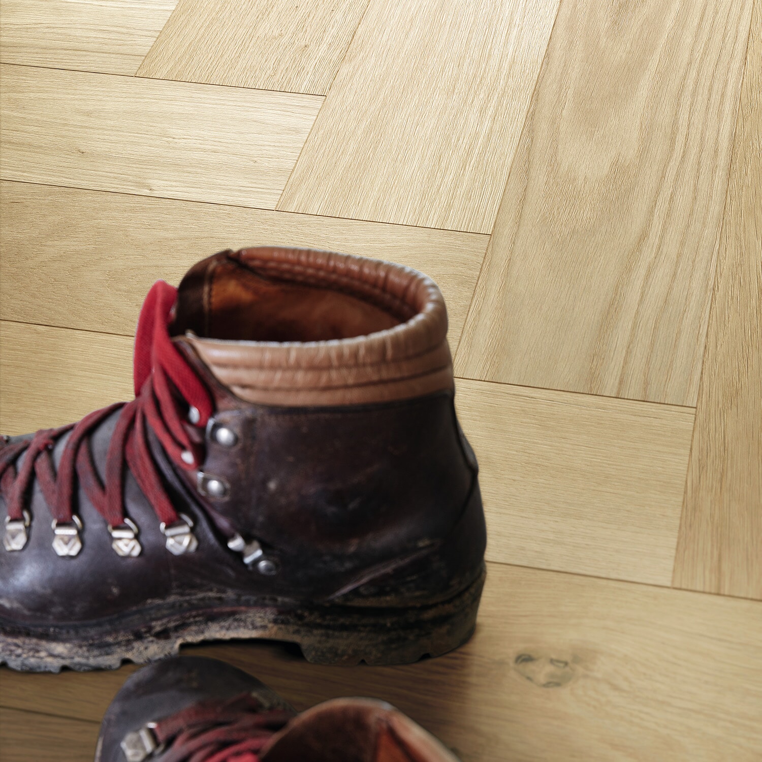 Lindura i fiskebeinsformat er en veldig moderne versjon av et klassisk leggemønster. Den ultramatte lakkerte finishen, som trenger fukt inn i hver eneste pore, får ikke bare dette gulvet til å se ekstra sofistikert og naturlig ut, men gjør det også spesielt lett å vedlikeholde og motstandsdyktig mot flekker og mikroriper (små riper i den lakkerte overflaten som ikke trenger gjennom til det ekte trebelegg). Dessuten er den til og med enkel å legge takket være det patenterte UniZip-klikksystemet.