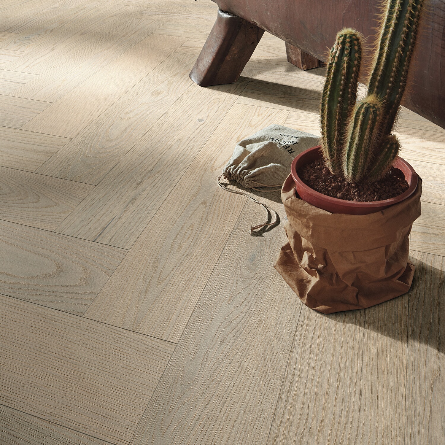 Lindura i fiskebeinsformat er en veldig moderne versjon av et klassisk leggemønster. Den ultramatte lakkerte finishen, som trenger fukt inn i hver eneste pore, får ikke bare dette gulvet til å se ekstra sofistikert og naturlig ut, men gjør det også spesielt lett å vedlikeholde og motstandsdyktig mot flekker og mikroriper (små riper i den lakkerte overflaten som ikke trenger gjennom til det ekte trebelegg). Dessuten er den til og med enkel å legge takket være det patenterte UniZip-klikksystemet.