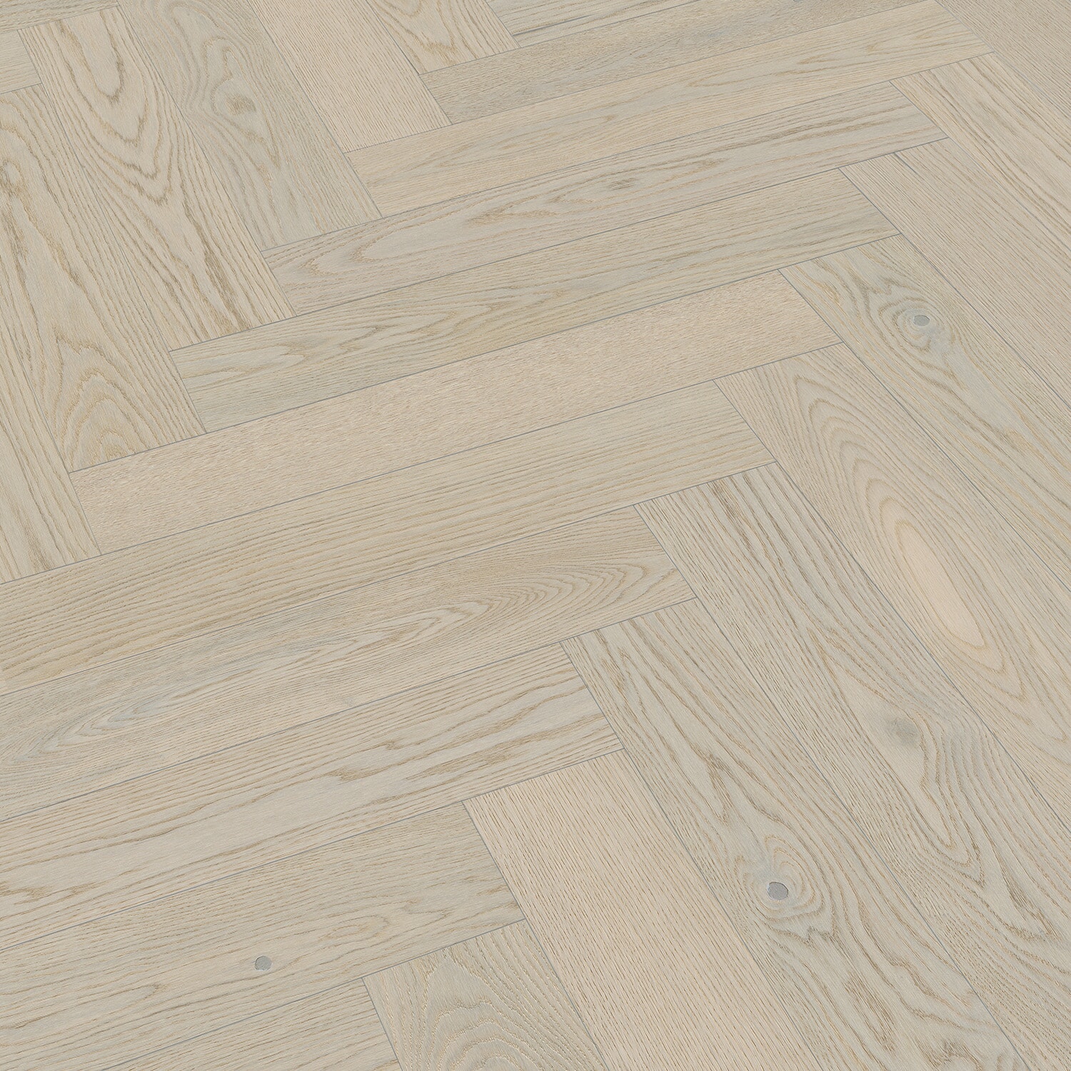 Meister Eik Arctic White har en fiskebengulv med et nydelig fargespill og kvist som gir et levende og tidløst utseende. Dette gjør at gulvet passer inn i alt fra klassiske til moderne hjem. Dette lyse fiskebeinsgulvet i eik, gjør at rommet får et luftig og lett uttrykk.