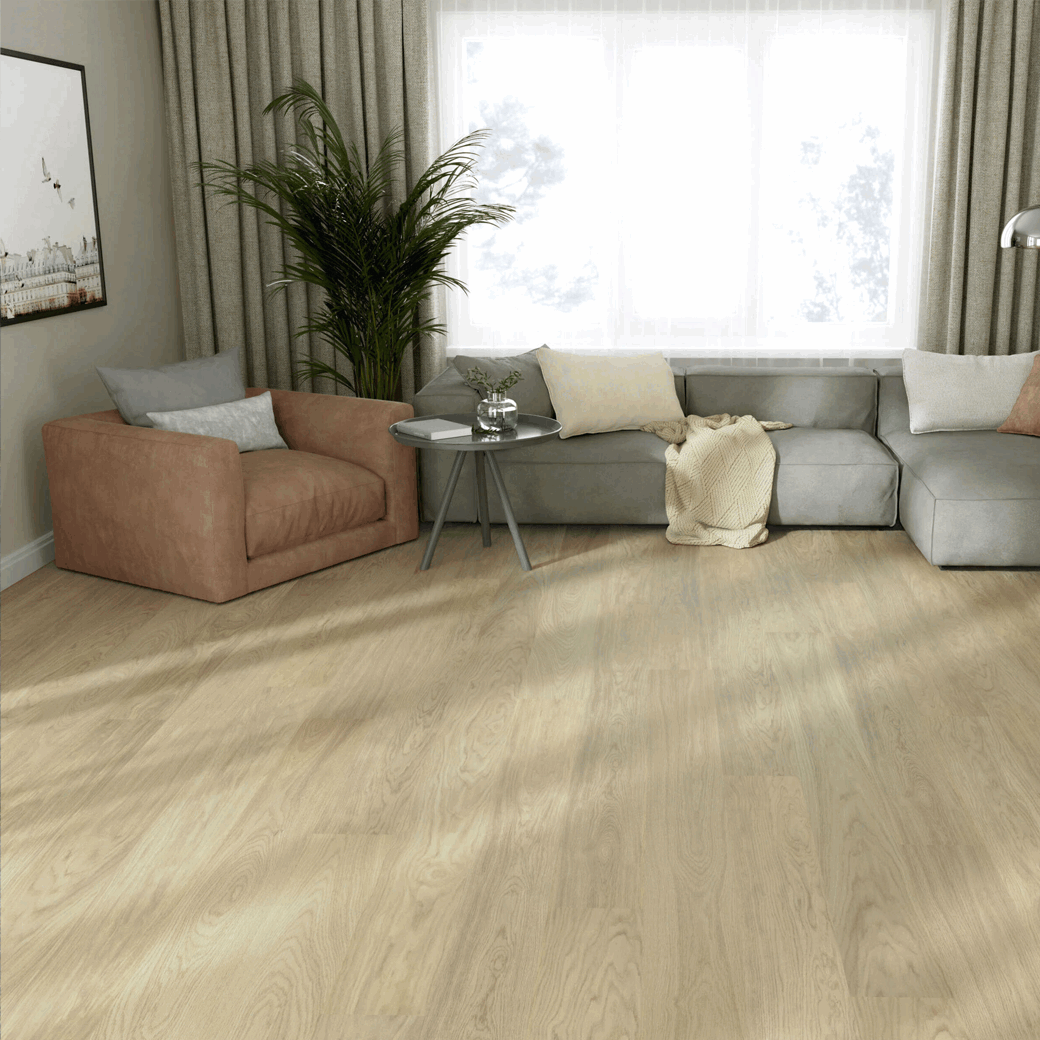 Esta Parkett Nova Eco Elite Dazy er en lys og elegant eikeparkett med en ekstra matt lakk som gir et naturlig og rolig uttrykk i rommet. Gulvet har en ren og rolig sortering med svært lite kvist, noe som gir et harmonisk og moderne helhetsinntrykk. Den brede plankedesignen og den subtile børstede teksturen fremhever treets varme toner, og skaper et lyst og innbydende rom med et skandinavisk preg.