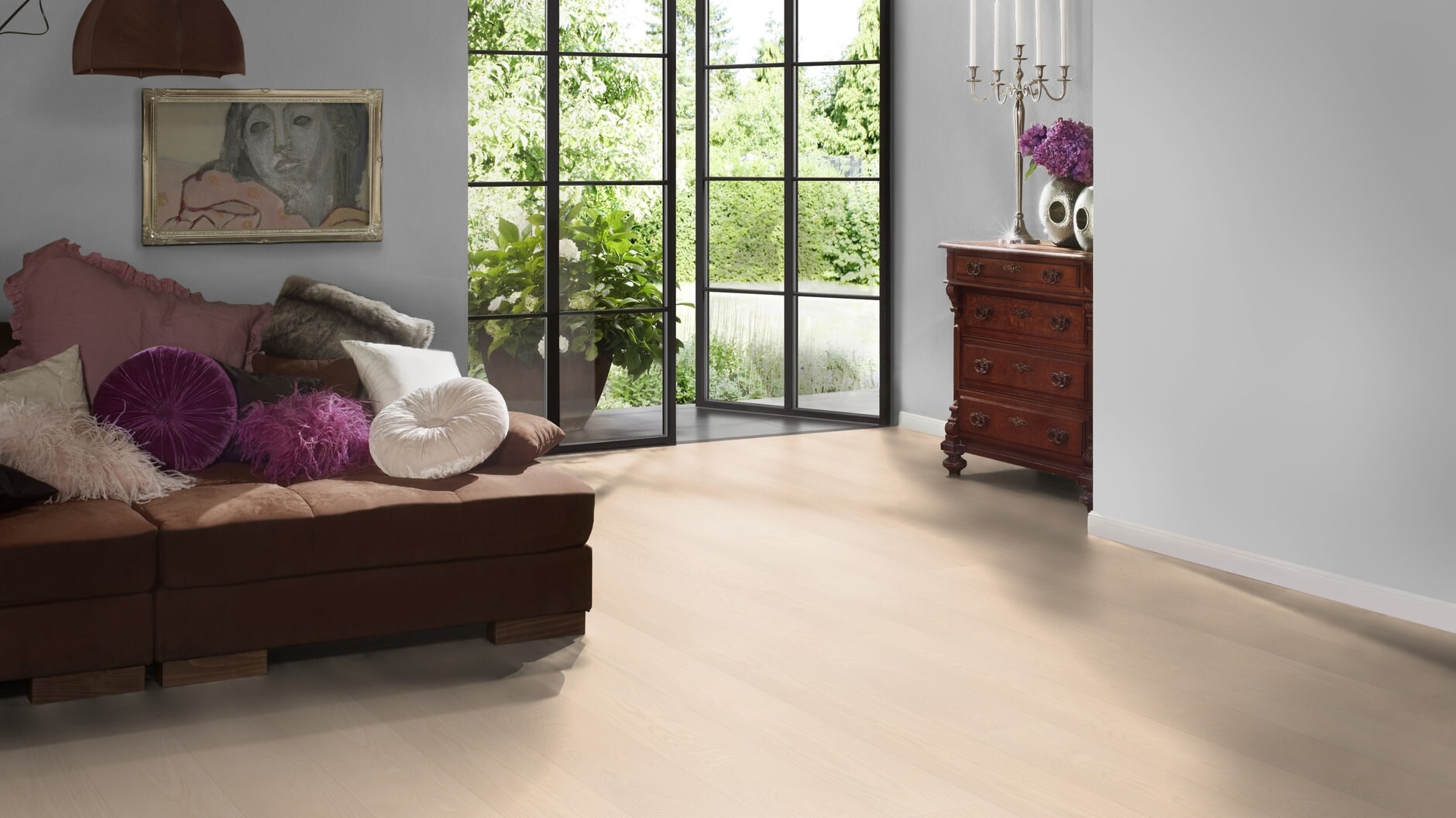 Ter Hurne Ask Hywood Evo Una er et børstet ekstramattlakkert herdet tregulv med et lyst og rent fargespill med helt uten kvist som gir et moderne, eksklusivt og stille utseende. Gulvet er hvitpigmentert og gjør at gulvet passer inn i alt fra gammeldagse til nymotens hjem. Dette lyse tregulvet skaper en god atmosfære i ett hvert rom.