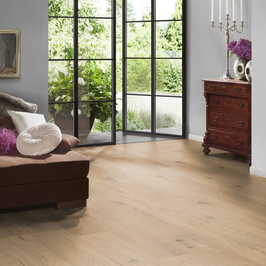 Ter Hurne Eik Hywood Evo Dovre er et børstet ekstramattlakkert herdet tregulv med et lyst og naturlig fargespill uten kvist som gir et moderne og stille utseende. Gulvet er hvitpigmentert og gjør at gulvet passer inn i alt fra gammeldagse til nymotens hjem. Dette lyse tregulvet skaper en god atmosfære i rommet.