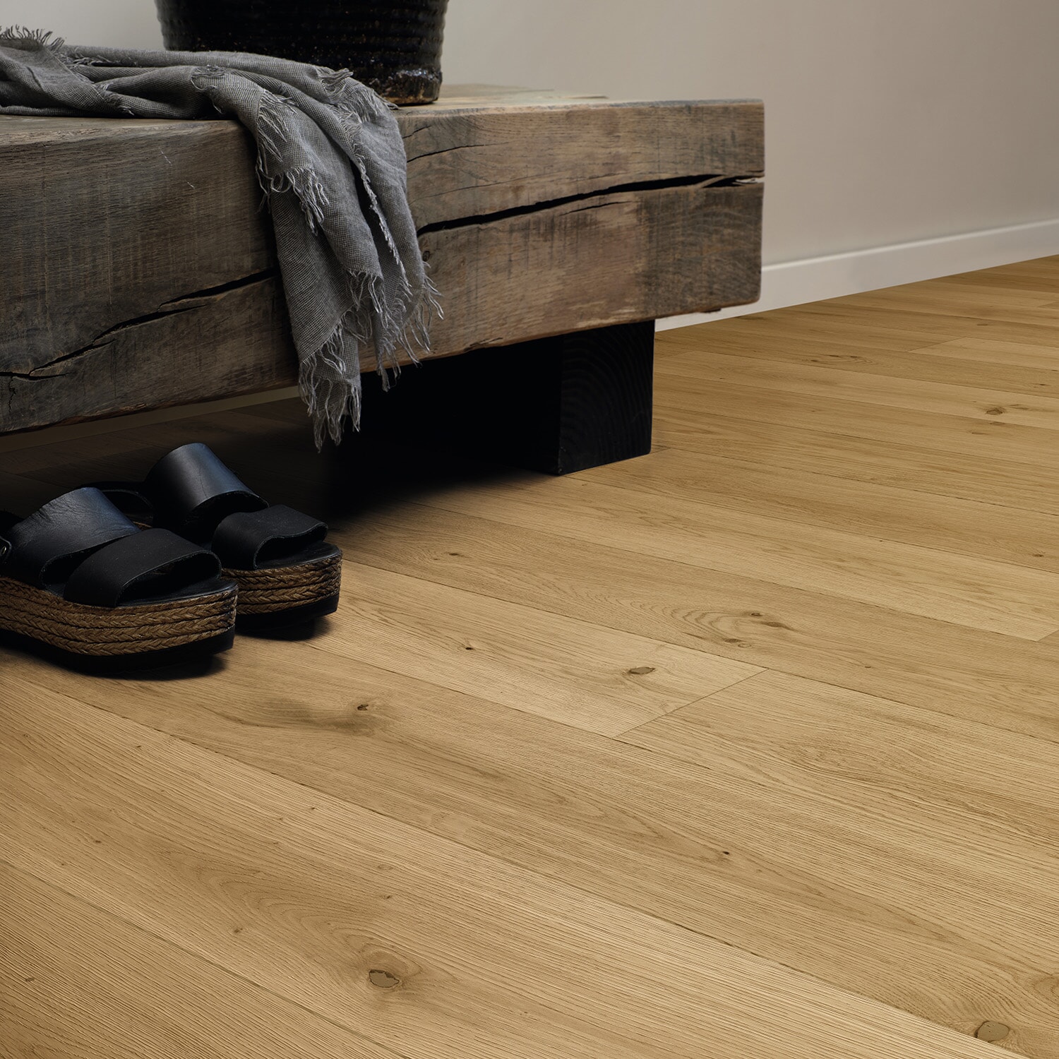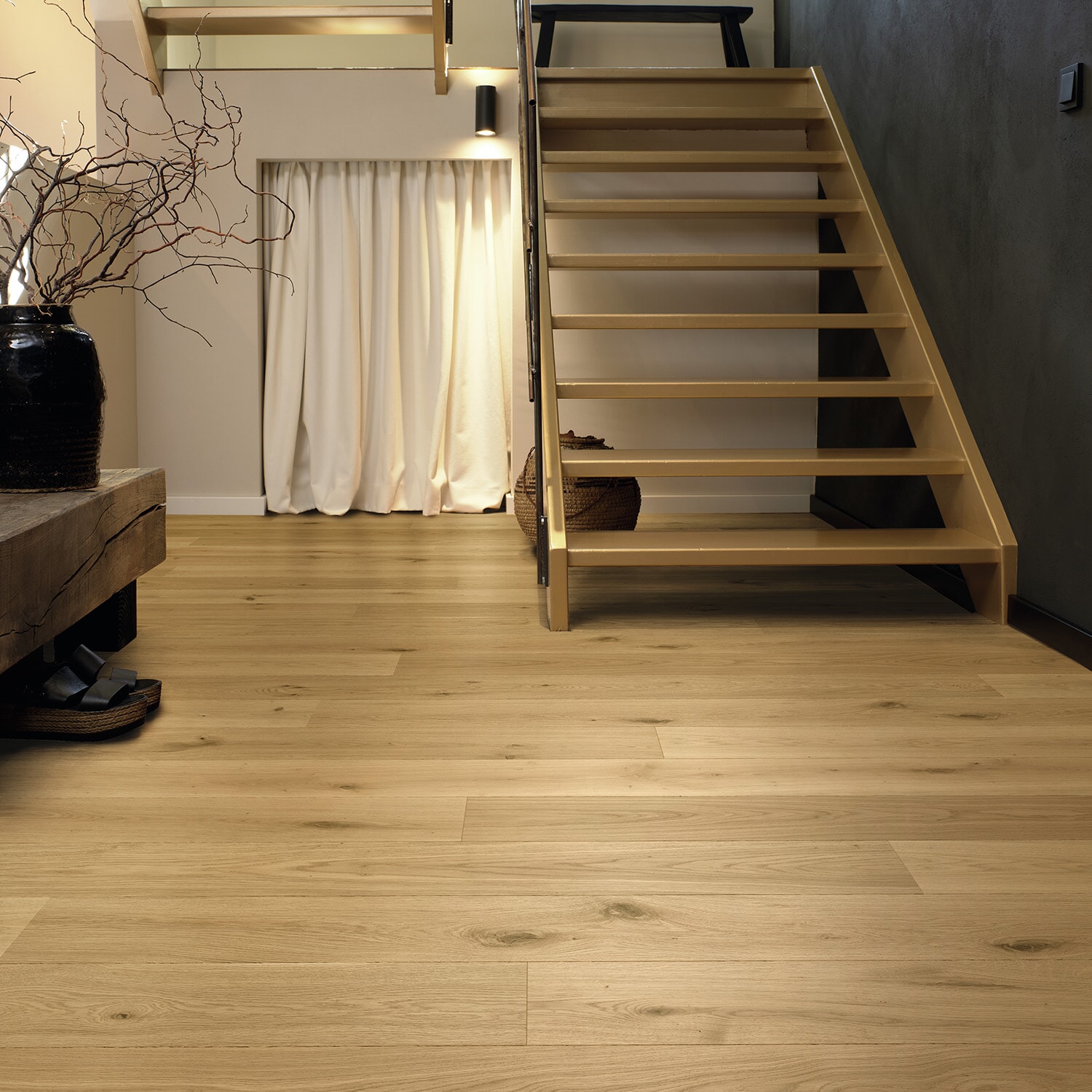 Oppgrader hjemmet ditt med denne tidløse, elegante og naturfargede 1-stavs eikeparketten. Denne vakre gulvløsningen vil umiddelbart gi rommet en varm og innbydende følelse. Den naturfargede 1-stavs ultramattlakkerte eikeparketten er et tidløst og elegant valg for enhver boliginnredning.