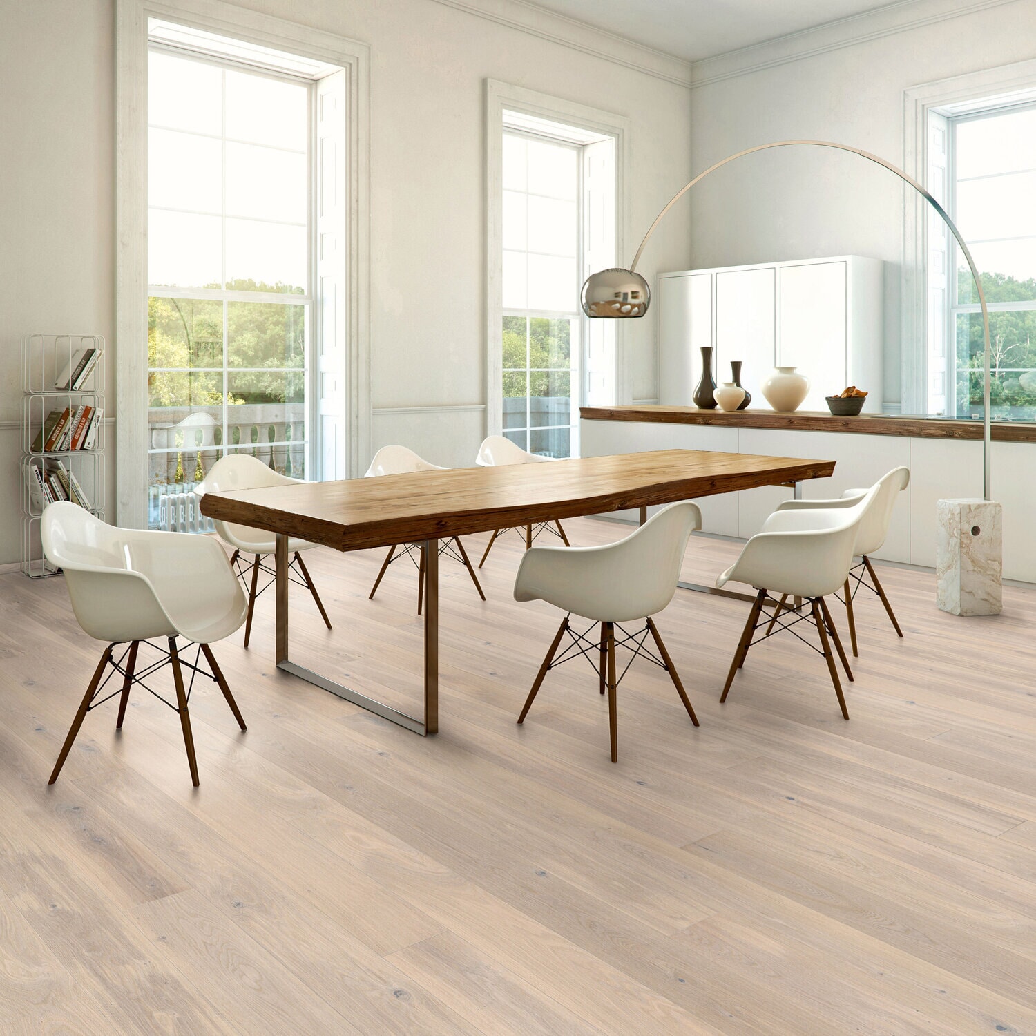 De 1-stavs brede gulvplankene feremhever den naturlige følelsen og viser treets fulle karakter. 4-V, minifas på lang- og kortside fremhever hvert enkelt bor og gir gulvet sjarm og eleganse. Hvis du planlegger å endre interiøret i huset ditt og gjøre det mer luksuriøst, så er et lett og hvitt gulv for deg et interessante alternativ. Den hvite parketten vil gjøre rommet lys, i motsetning til mørk parkett som krever mye kunstig belysning.